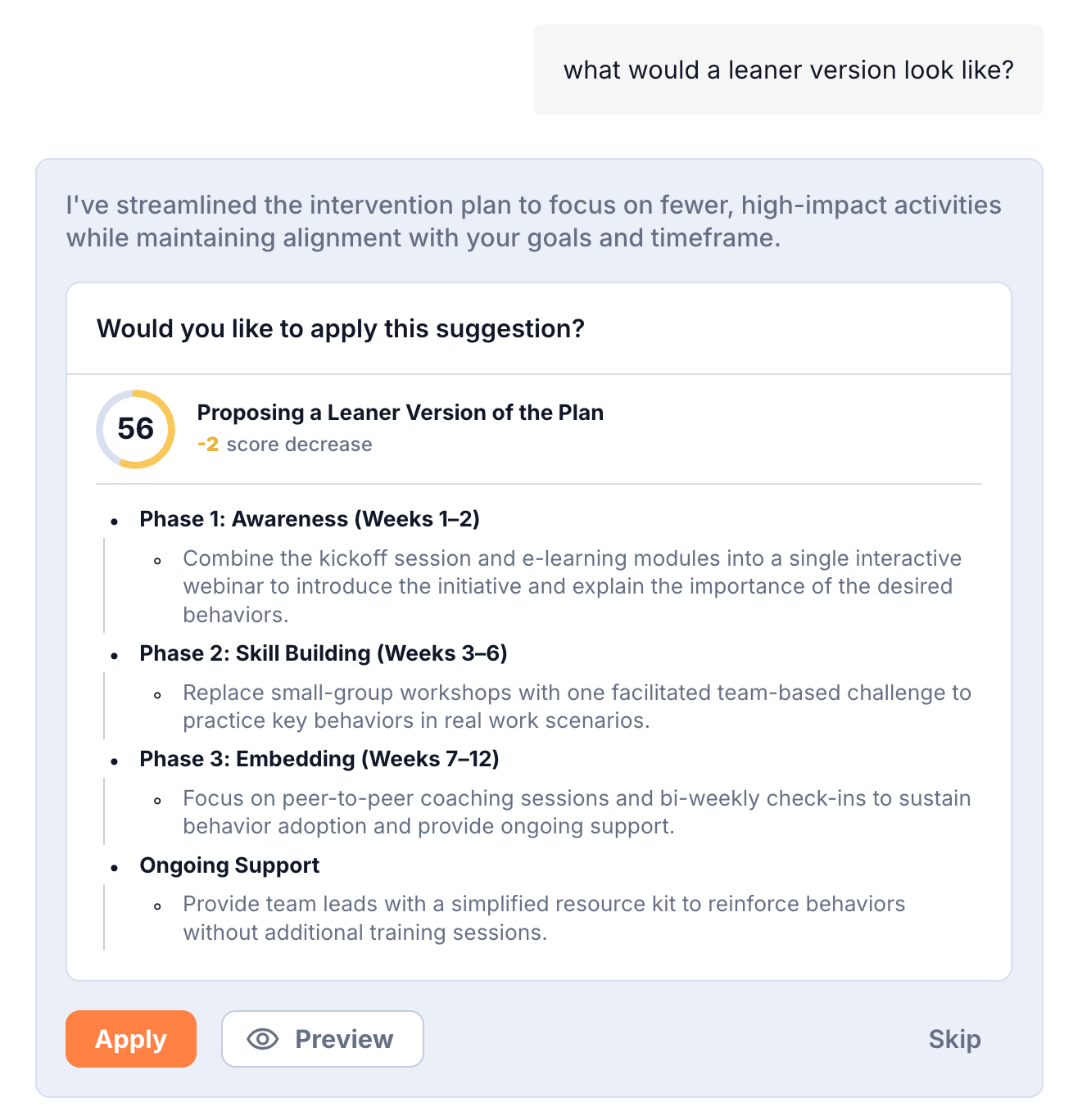 If the plan feels too detailed or too heavy for your needs, just tell Tilda. You can ask for a leaner version and Tilda will simplify things, maybe reducing delivery time, cutting interventions, or combining interventions. Bear in mind that this may affect your Behavior Change Score!
